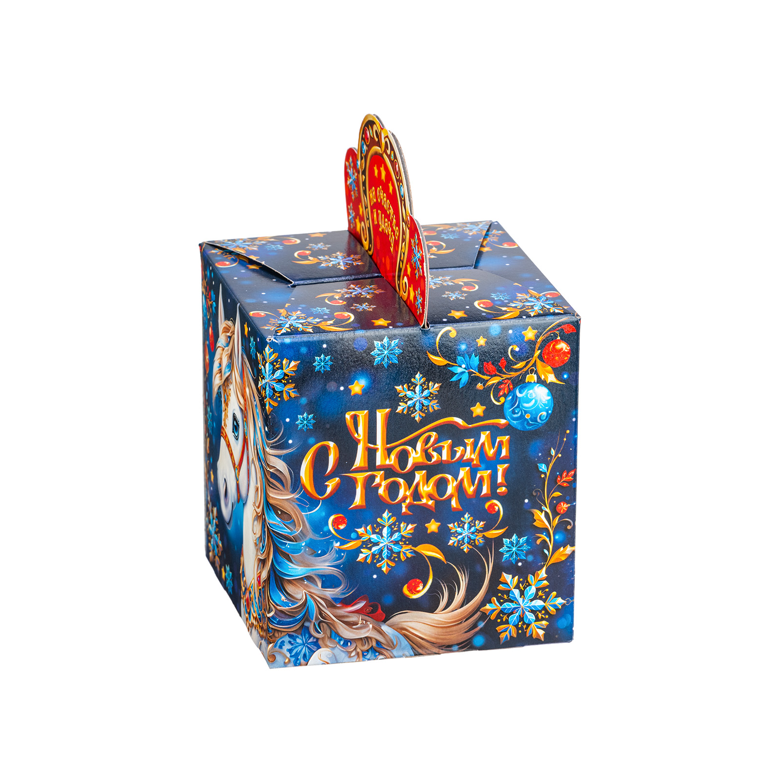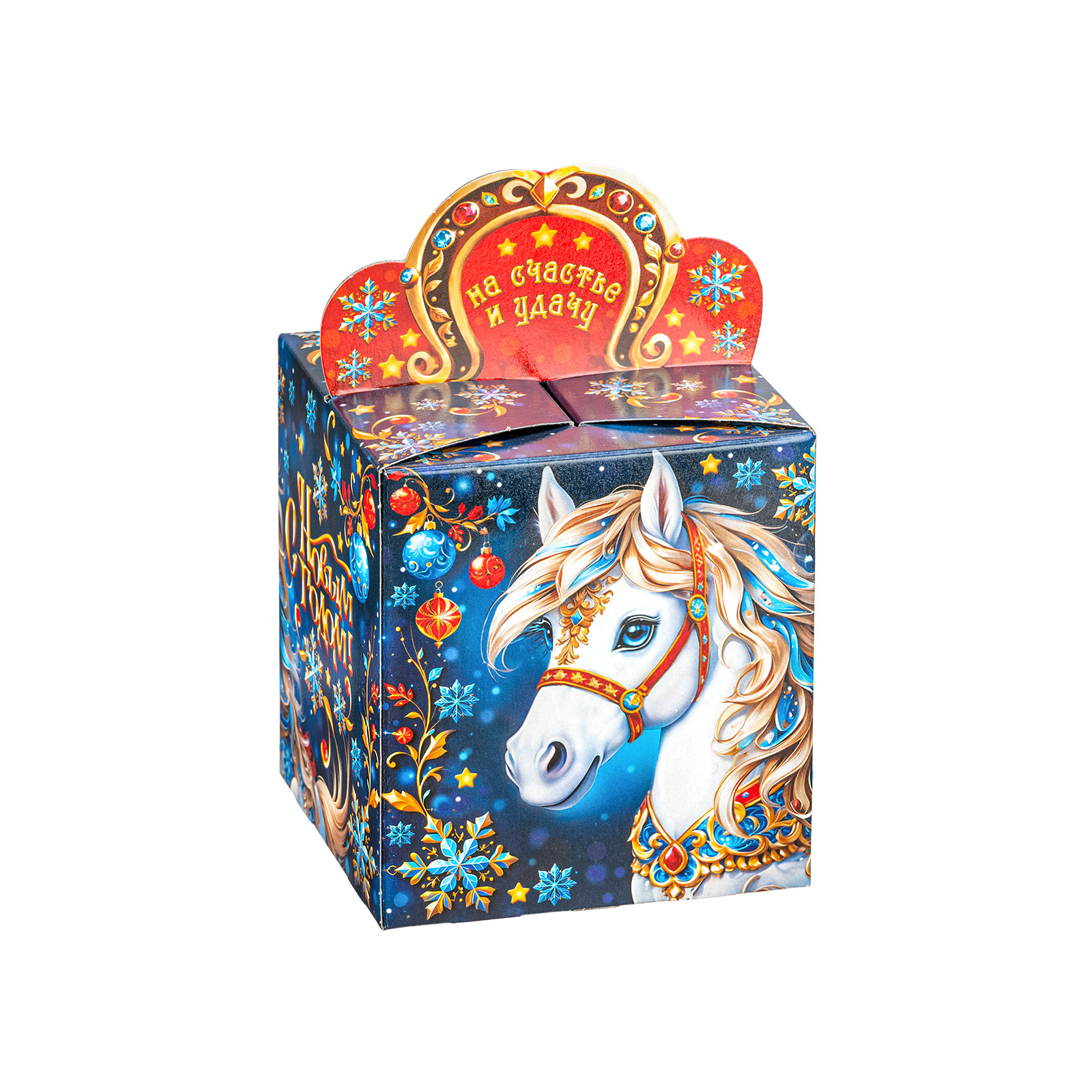 Интересный вариант новогоднего подарка – «Калейдоскоп удачи». Он представлен в разделе Картон. Отлично подойдет на подарок в 2026 году с символом Лошадь. Внутри такого презента находится кондитерский набор весом 300 граммов.